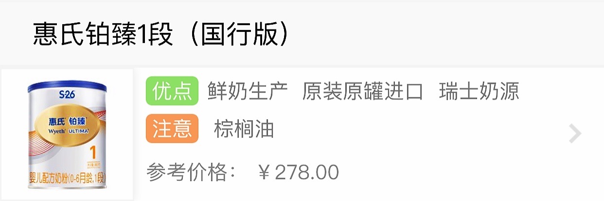 原料方面,各位要注意一下,S-26金装1段添加了棕榈油,棕榈油有两个坏处,一是会影响宝宝对钙的吸收,二是会增加宝宝大便的硬度而更难排出,增加了便秘的几率。
